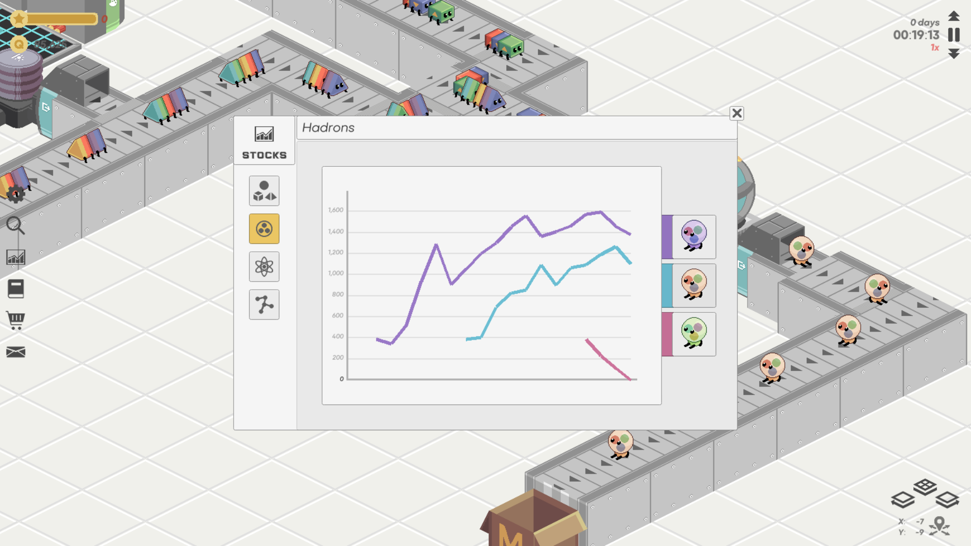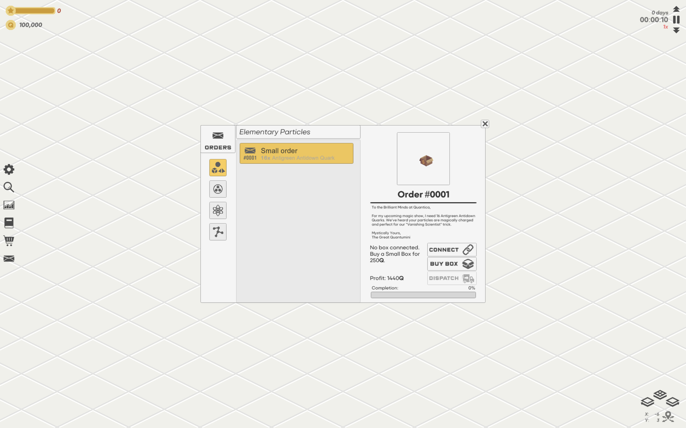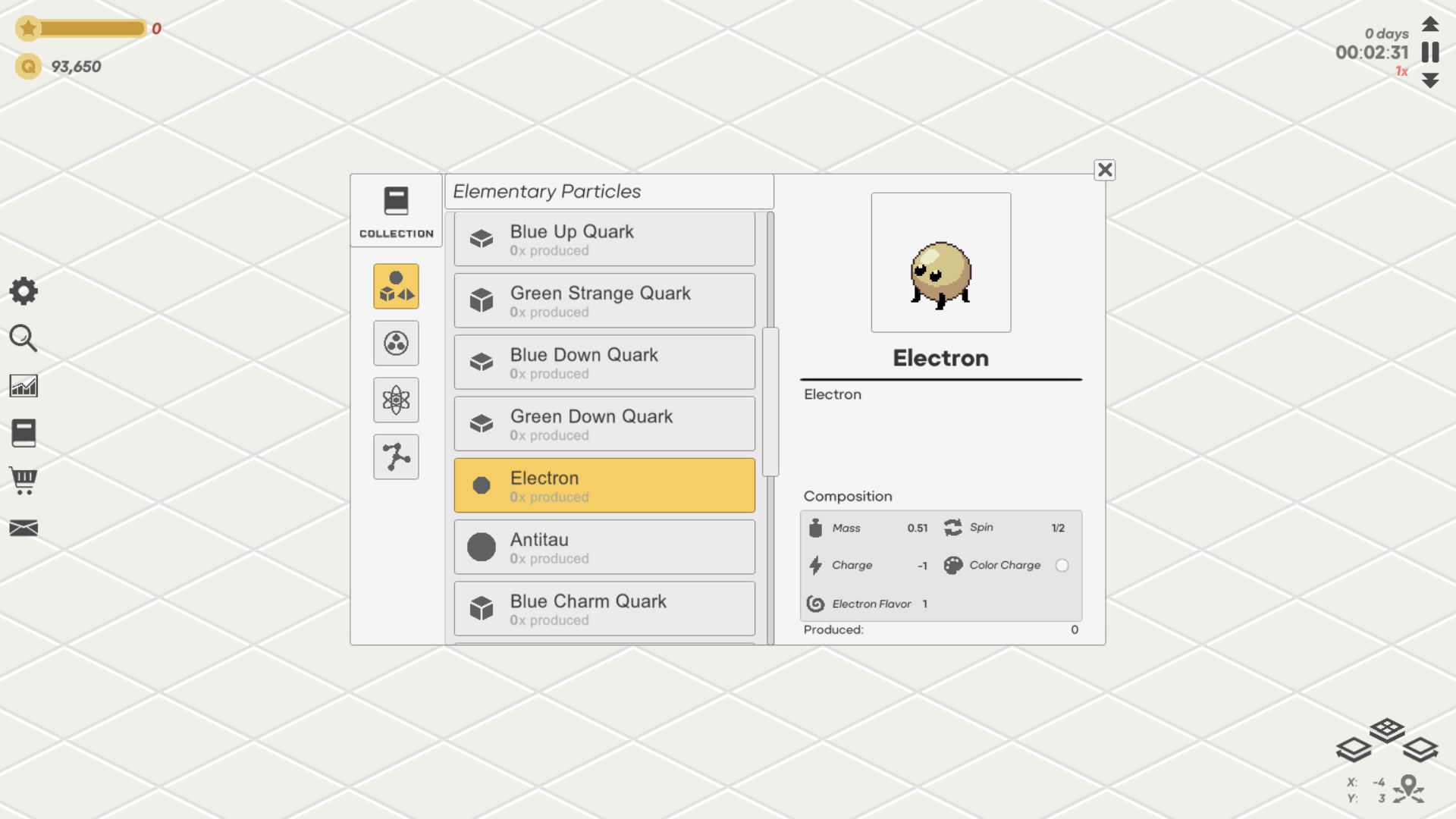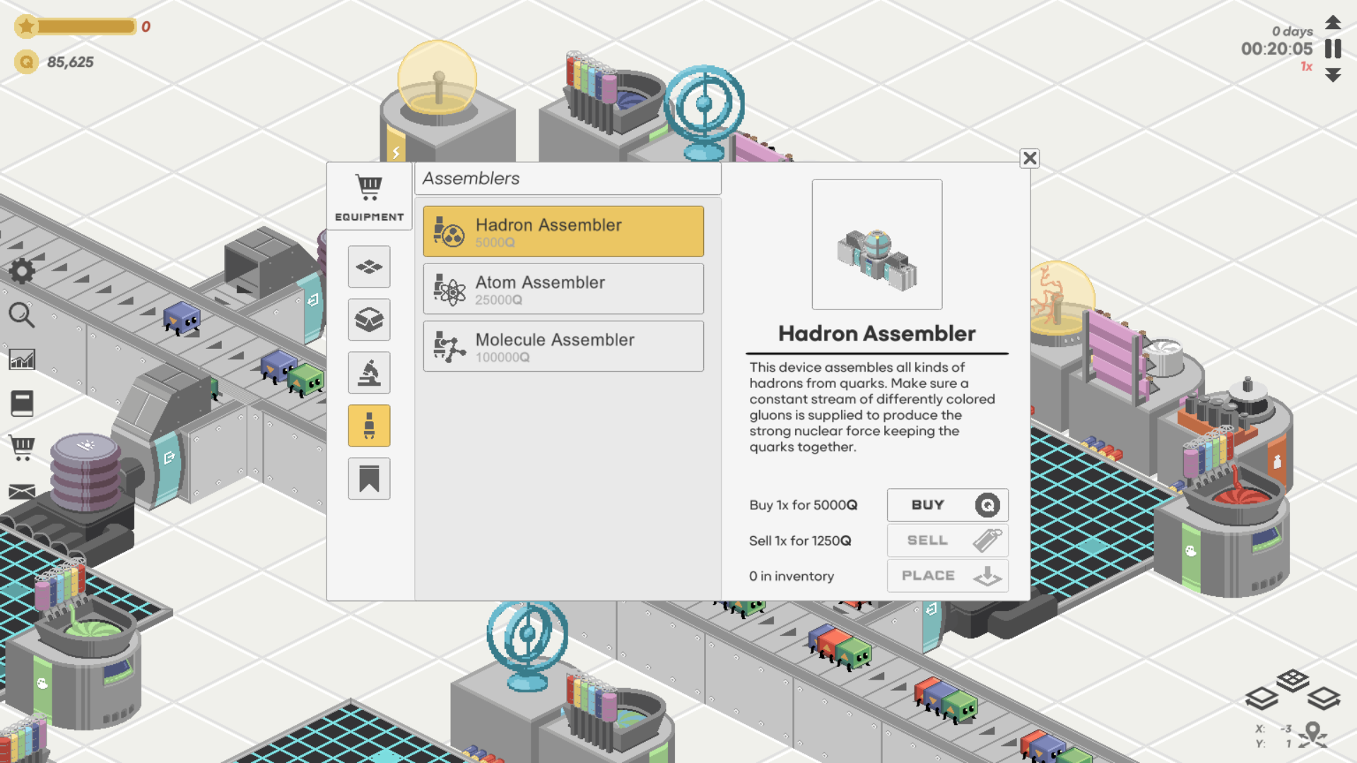 The player’s task is to run a factory producing particles with increasing complexity, going from Quarks to Hadrons to Atoms to Molecules.