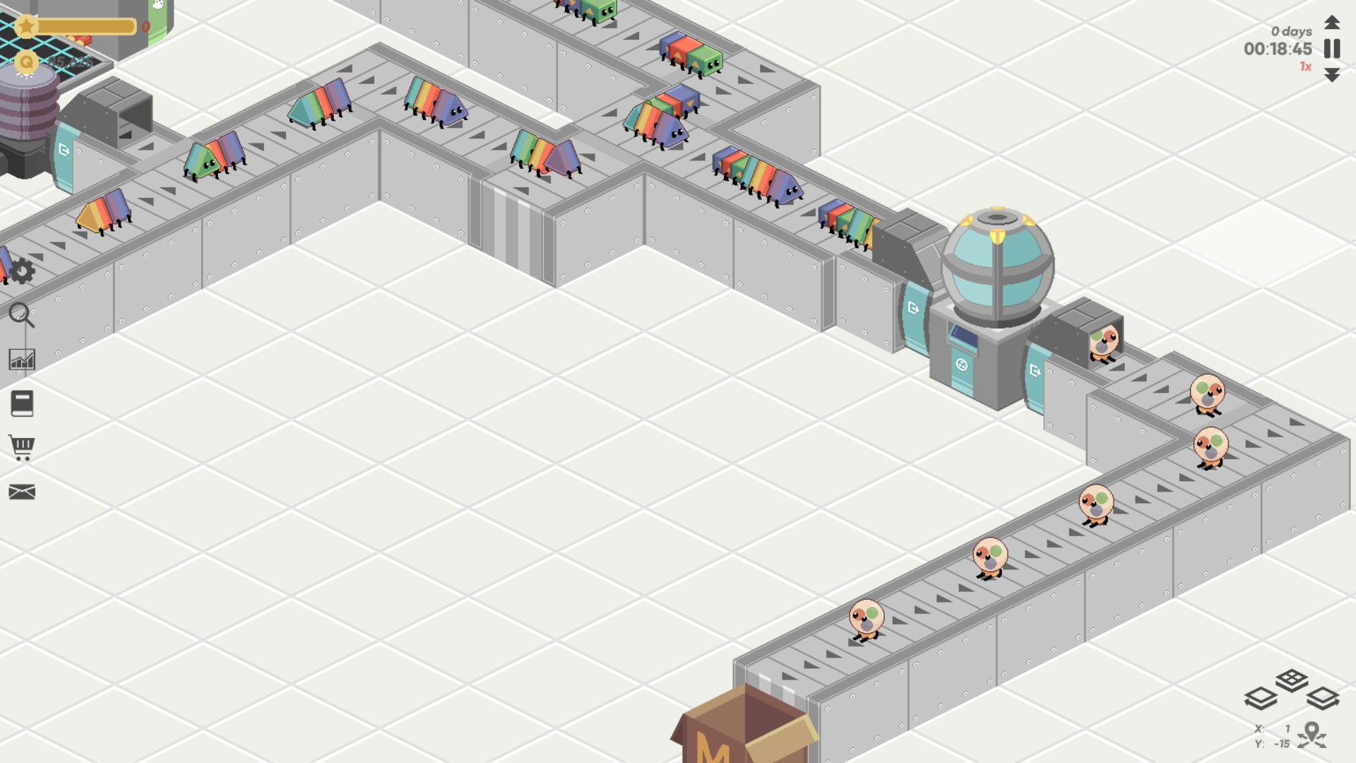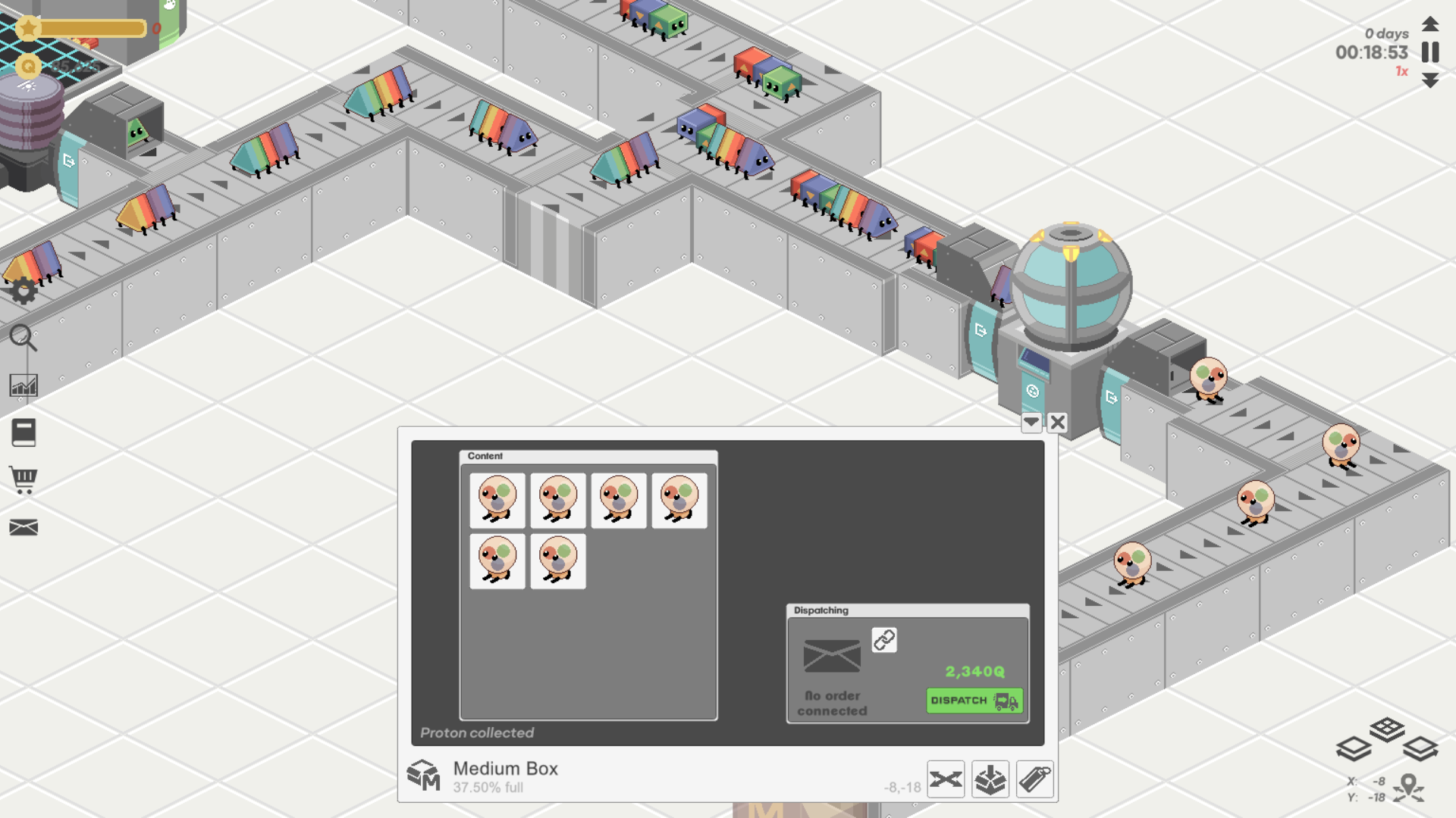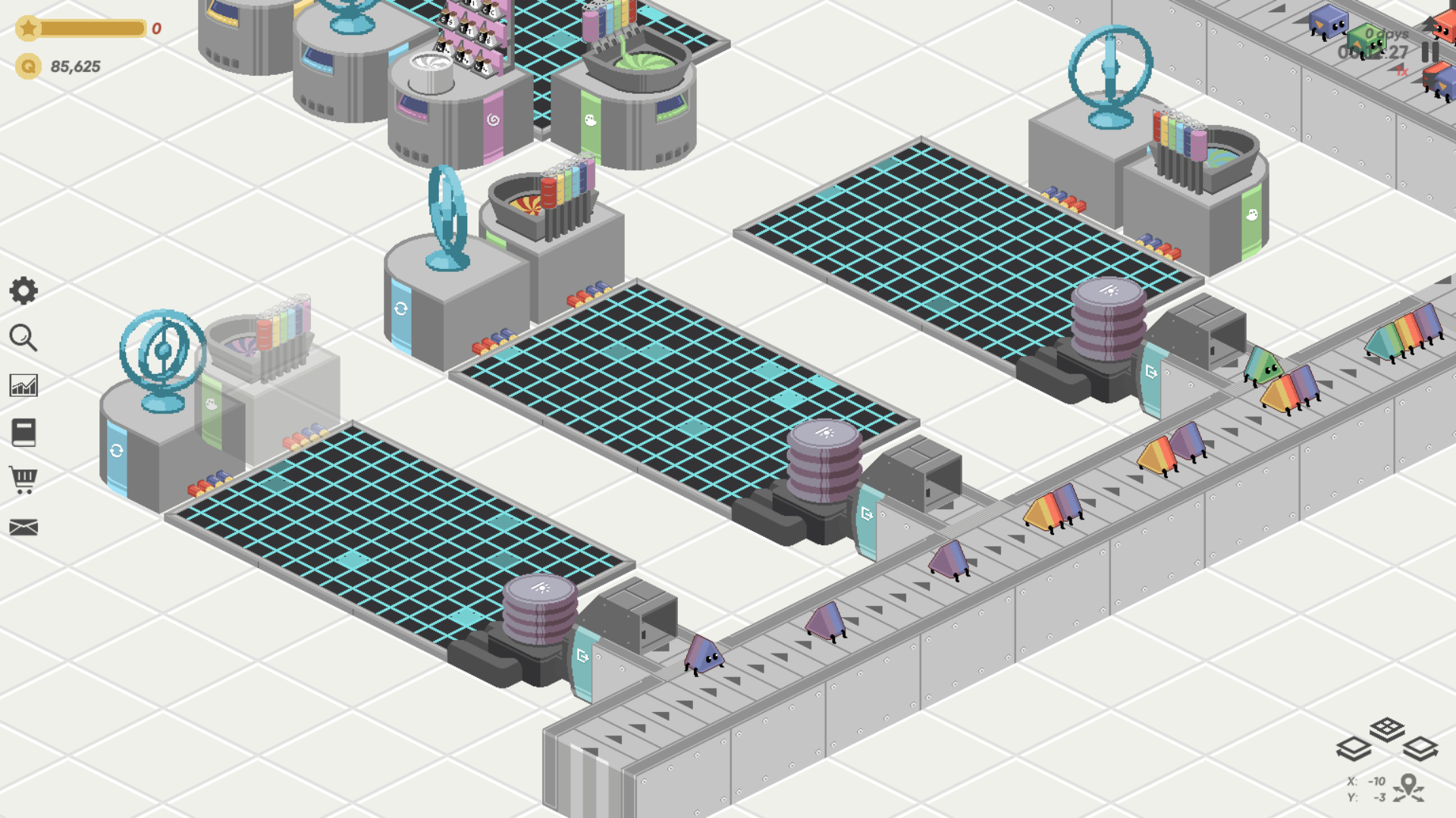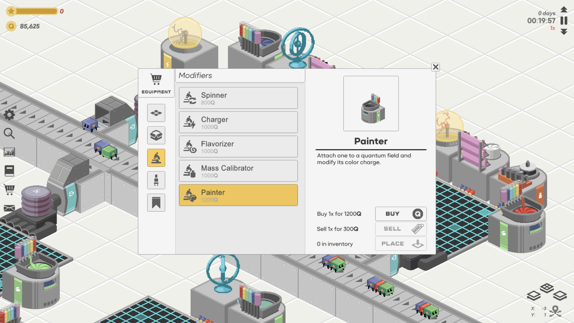 The player’s task is to run a factory producing particles with increasing complexity, going from Quarks to Hadrons to Atoms to Molecules.